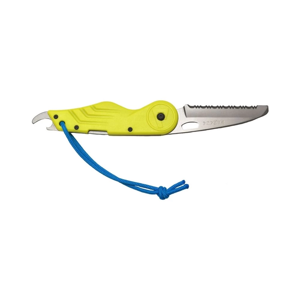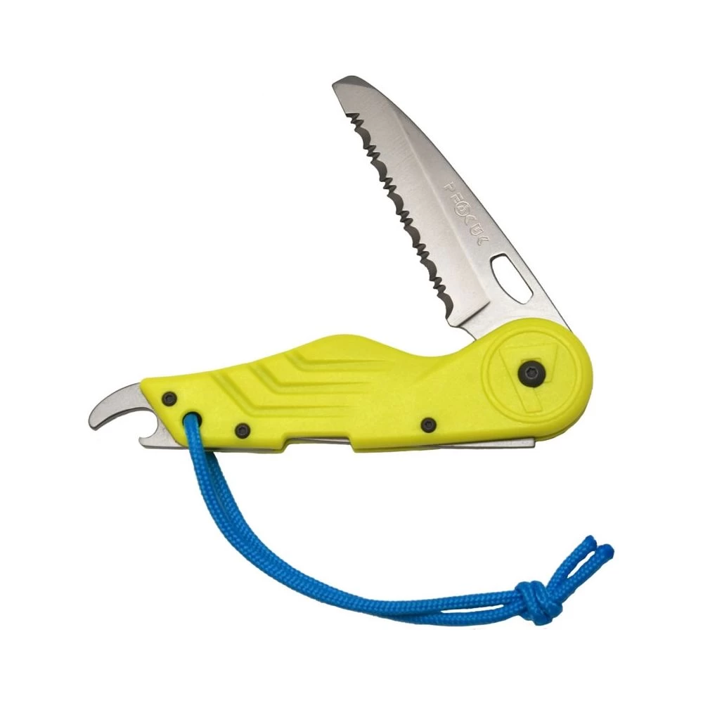 Couteau de sécurité pour le canoë et le kayak de rivière et d’eau vive, doté d’une lame dentelée repliable et verrouillable, revêtue de titane avec une pointe plate.