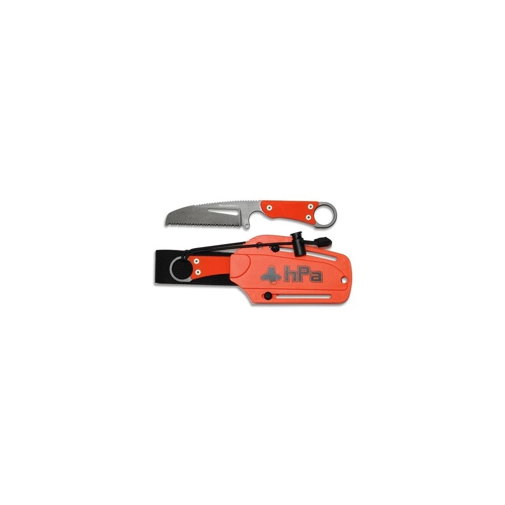 Large anneau à l’arrière de la poignée pour fixation d’un leach. Étui réversible, permettant le port du couteau dans de multiples positions : sur un gilet de sauvetage, un harnais ou un baudrier, sur un stab, etc.