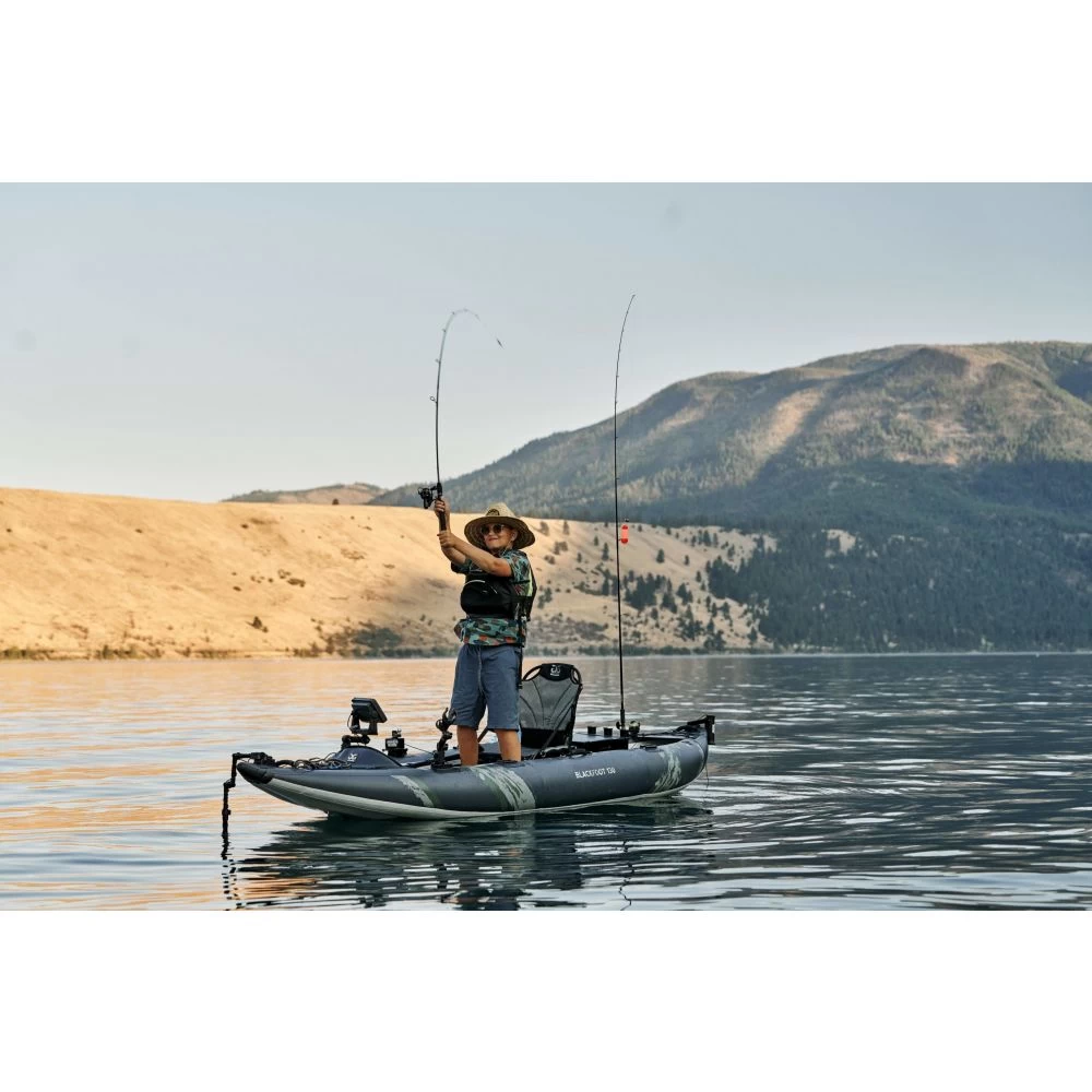 La gamme Blackfoot est optimisés pour la pêche et comprend des caractéristiques techniques qui améliorent votre expérience sur l’eau. Les kayaks sont construits avec des chambres principales en PVC renforcé de tissu Duratex et un plancher en Dropstitch pour une bonne rigidité globale. Il en résulte des kayaks très facile à gonfler, très facile à sécher et plus compact. Précisons également qu’ils sont livré avec un sac de transport de style Sac à dos afin de stocker et transporter son kayak sans aucun effort.