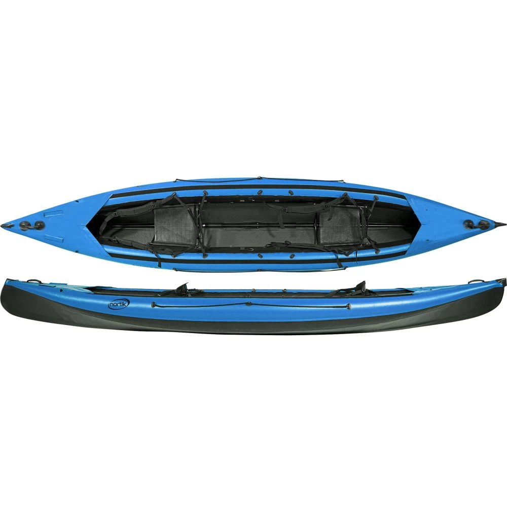 Avec le scubi 2 XL, la technologie hybride nortik prend un nouveau tournant. Ce kayak est de loin le plus polyvalent de toute la famille scubi. Le montage est toujours aussi rapide, les performances nautiques sont excellentes et surtout, on peut l’utiliser de mille façons différentes! Même type de construction que notre best-seller le scubi 1 XL, cette variante biplace offre plus de flexibilité que son petit frère. En installant le 3ème siège optionnel au centre (2 positions possibles), on peut varier entre monoplace, biplace et triplace. Un petit enfant peut s’asseoir face au pagayeur arrière, un enfant moyen peut pagayer dans le sens de la marche, le pagayeur solo s’installe dans la position idéale au milieu. Le scubi 2 XL grandit avec vous et se transforme au gré de vos exigences!