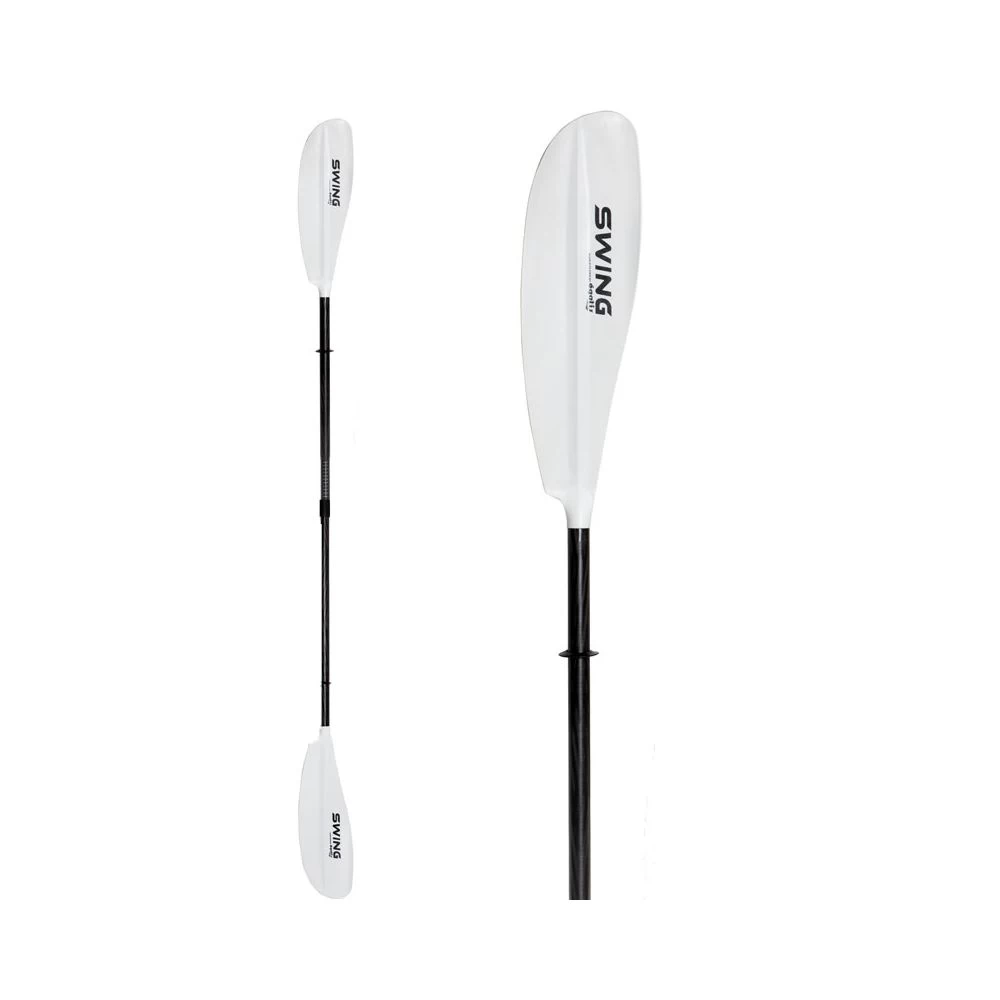 La pagaie Swing Vario est démontable en 2 parties. Elle est munie d’un système de réglage permettant de faire varier sa longueur de 225 à 235 cm et son angle.