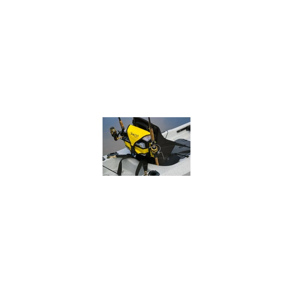 Le siège est équipé à l’arrière avec un sac détachable qui contient 3 boites à leurre ainsi que 2 porte cannes.